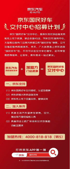 “國(guó)民好車”是京東汽車聯(lián)合主機(jī)廠、電池廠商等產(chǎn)業(yè)伙伴打造的系列化高品質(zhì)車型。其中,京東主要提供用戶消費(fèi)洞察與獨(dú)家銷售服務(wù),不直接涉及制造環(huán)節(jié)。京東汽車發(fā)起“國(guó)民好車”交付中心招募計(jì)劃,將整合資源攜手行業(yè)伙伴推進(jìn)服務(wù)網(wǎng)絡(luò)落地,并助力傳統(tǒng)4S店、經(jīng)銷商等向“多品牌”店轉(zhuǎn)型。
