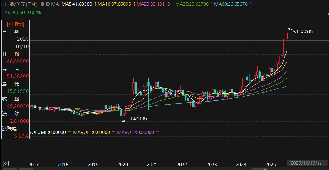 10月9日,現(xiàn)貨白銀價格突破50美元/盎司,為歷史首次。10月10日,據(jù)東方財富Choice數(shù)據(jù),白銀開盤價報46.67美元/盎司,最高達51.38美元/盎司,年內(nèi)漲幅超70%。