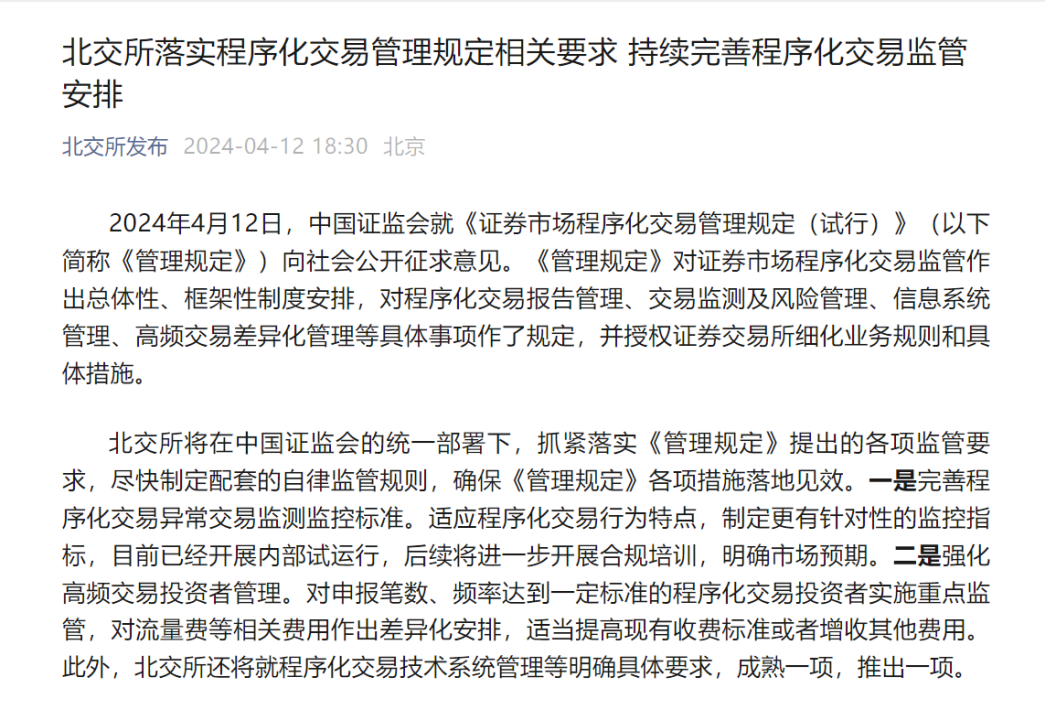 4月12日,中國證監(jiān)會(huì)就《證券市場(chǎng)程序化交易管理規(guī)定(試行)》(以下簡(jiǎn)稱《管理規(guī)定》)向社會(huì)公開征求意見?!豆芾硪?guī)定》對(duì)證券市場(chǎng)程序化交易監(jiān)管作出總體性、框架性制度安排,對(duì)程序化交易報(bào)告管理、交易監(jiān)測(cè)及風(fēng)險(xiǎn)管理、信息系統(tǒng)管理、高頻交易差異化管理等具體事項(xiàng)作了規(guī)定,并授權(quán)證券交易所細(xì)化業(yè)務(wù)規(guī)則和具體措施。