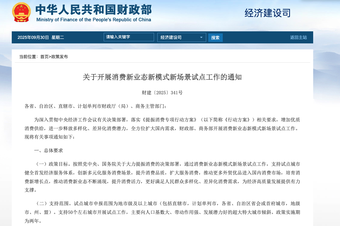 財(cái)政部9月30日發(fā)布消息稱,為深入貫徹中央經(jīng)濟(jì)工作會(huì)議有關(guān)決策部署,落實(shí)《提振消費(fèi)專項(xiàng)行動(dòng)方案》相關(guān)要求,增加優(yōu)質(zhì)消費(fèi)供給,進(jìn)一步釋放多樣化、差異化消費(fèi)潛力,全方位擴(kuò)大國(guó)內(nèi)需求,財(cái)政部、商務(wù)部聯(lián)合印發(fā)了《關(guān)于開展消費(fèi)新業(yè)態(tài)新模式新場(chǎng)景試點(diǎn)工作的通知》。