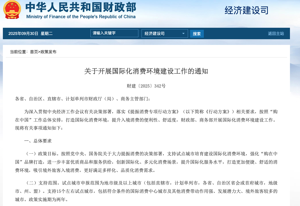 同日,財(cái)政部、商務(wù)部還發(fā)布了《關(guān)于開展國(guó)際化消費(fèi)環(huán)境建設(shè)工作的通知》(以下簡(jiǎn)稱《通知》),明確為更好發(fā)揮消費(fèi)在穩(wěn)增長(zhǎng)、惠民生中的重要作用,更好滿足多樣化、品質(zhì)化消費(fèi)需求,助力擴(kuò)大入境消費(fèi),將在全國(guó)選取15個(gè)左右試點(diǎn)城市,開展國(guó)際化消費(fèi)環(huán)境建設(shè)工作。試點(diǎn)城市范圍包括符合條件的國(guó)際消費(fèi)中心城市及其他消費(fèi)帶動(dòng)作用強(qiáng)、發(fā)展?jié)摿Υ?、境外旅客較多的地市級(jí)及以上城市。