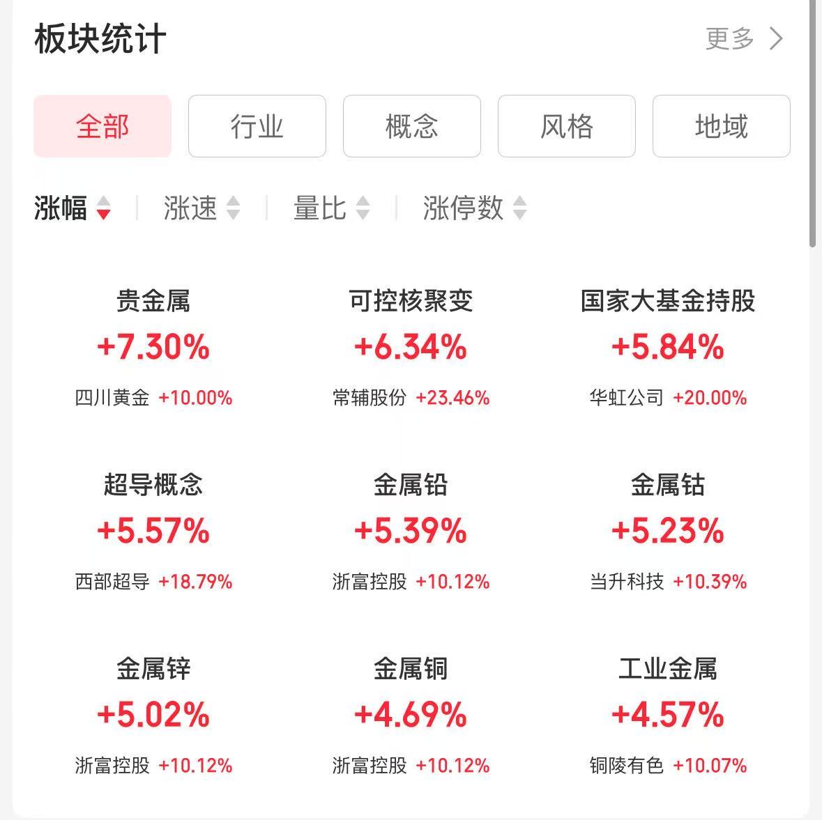 10月9日,國慶中秋“雙節(jié)”假期后開市第一天,同花順行情數(shù)據(jù)顯示,A股市場早間開盤,貴金屬、有色金屬、小金屬等行業(yè)板塊大漲,四川黃金、江西銅業(yè)、白銀有色開盤直線漲停。截至午間收盤,銅陵有色、云南銅業(yè)、西部礦業(yè)、山東黃金等股也“10CM”漲停,興業(yè)銀錫、洛陽鉬業(yè)等漲超9%,中金黃金、北方銅業(yè)、紫金礦業(yè)漲超8%。