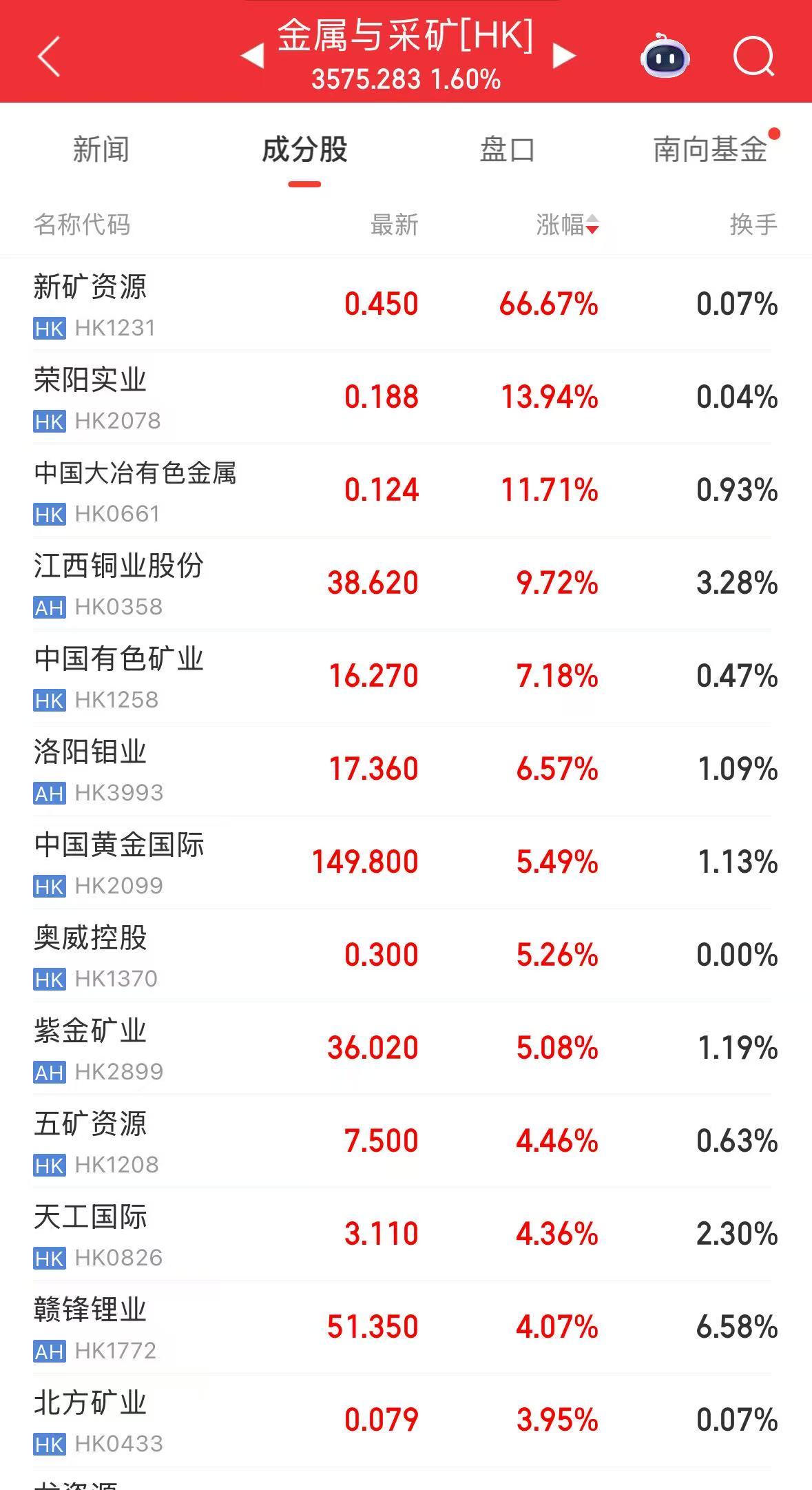 港股市場,中國黃金國際、江西銅業(yè)股份、大唐黃金、洛陽鉬業(yè)、紫金礦業(yè)延續(xù)漲勢,截至記者11點36分發(fā)稿時,江西銅業(yè)股份漲超9%。
