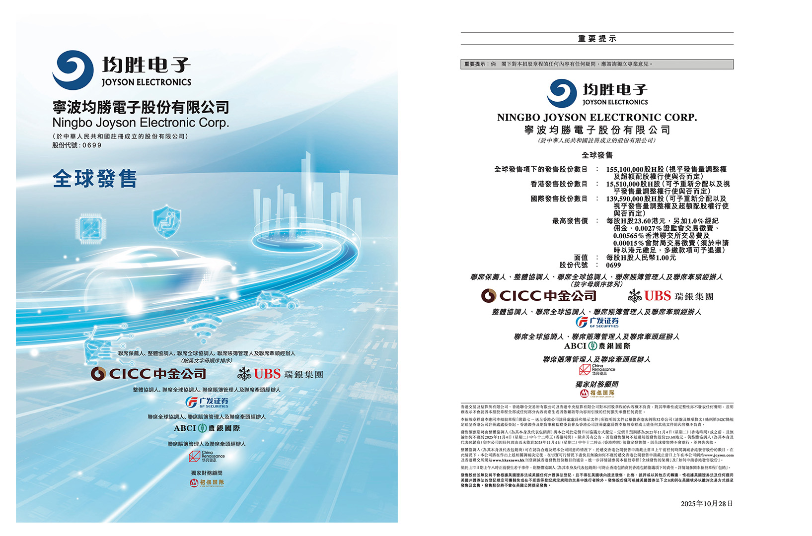 本報(bào)訊 (記者吳奕萱)10月28日,智能汽車科技解決方案提供商寧波均勝電子股份有限公司(以下簡(jiǎn)稱“均勝電子”)正式開啟港股招股,招股期持續(xù)至11月3日,計(jì)劃于11月6日正式以“0699”為股票代碼在港交所主板掛牌。成功上市后,均勝電子將成為“A+H”兩地上市的“汽車+機(jī)器人Tier1”雙龍頭企業(yè)。