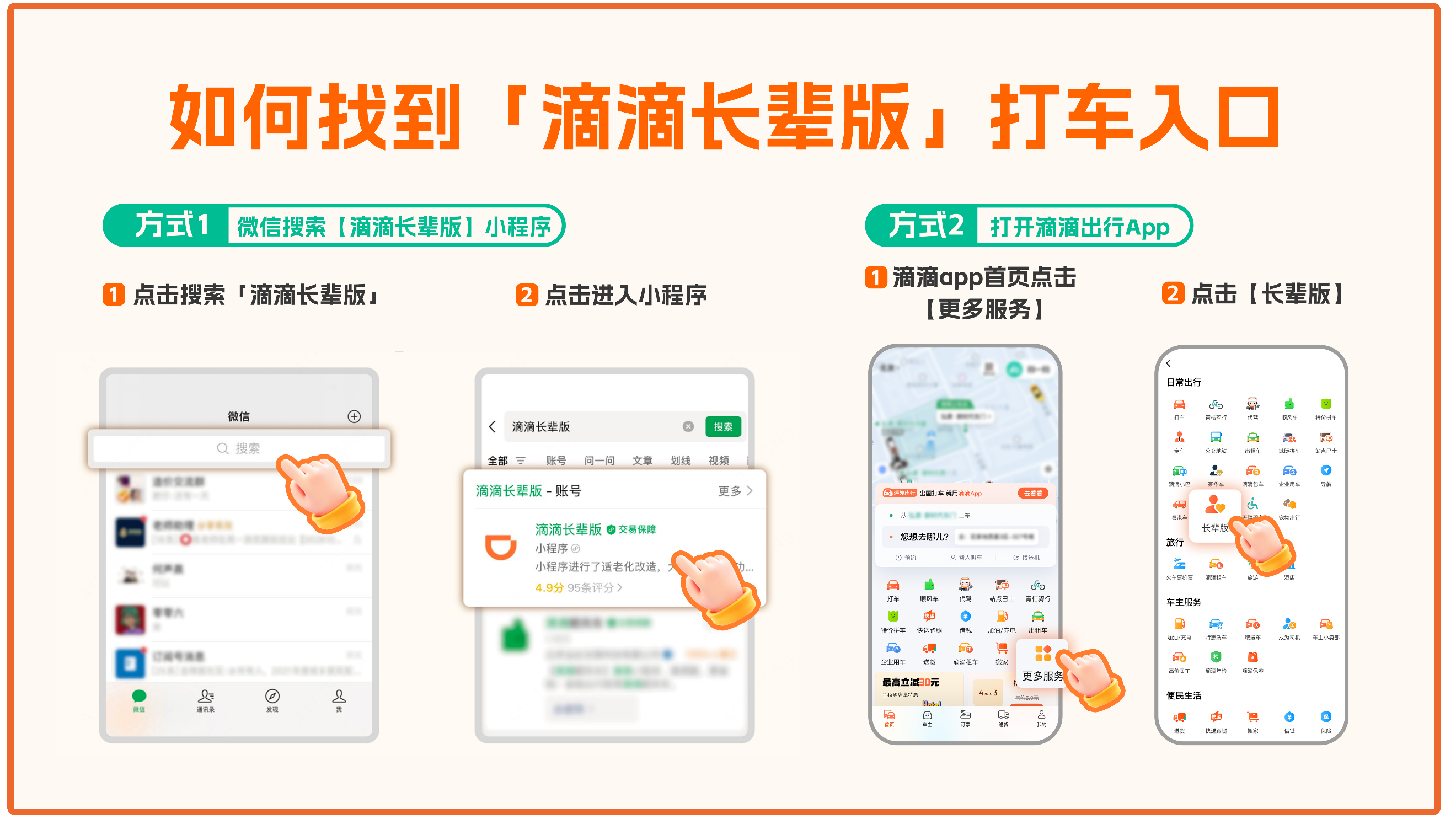在主管部門指導下,滴滴于2021年1月份正式上線助老打車服務。在滴滴出行App或微信小程序主頁點擊“更多服務”找到即可體驗。子女可協助家中長輩在微信搜索框輸入“滴滴長輩版”進入小程序,幫助老人“更快上手”,滿足“一鍵出行”的日常需求,讓跨越代際的溫暖在指尖持續(xù)傳遞。