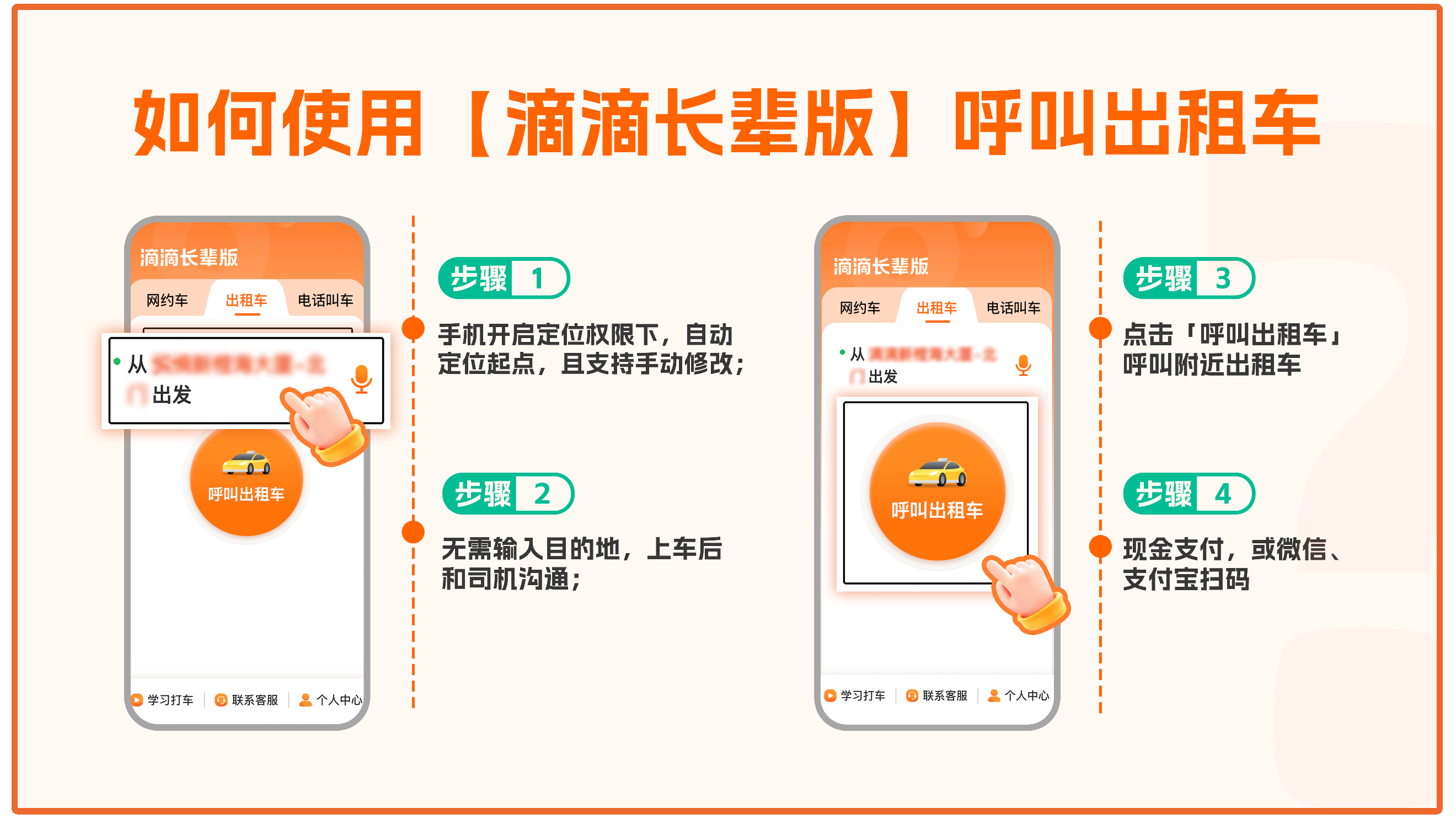 操作流程大幅簡化,提供“一鍵叫車”功能,老年用戶呼叫出租車時,無需輸入目的地即可發(fā)單;考慮到支付習慣,產品保留了出租車的線下現金支付方式,只為讓長輩們的出行少一分躊躇,多一分從容。