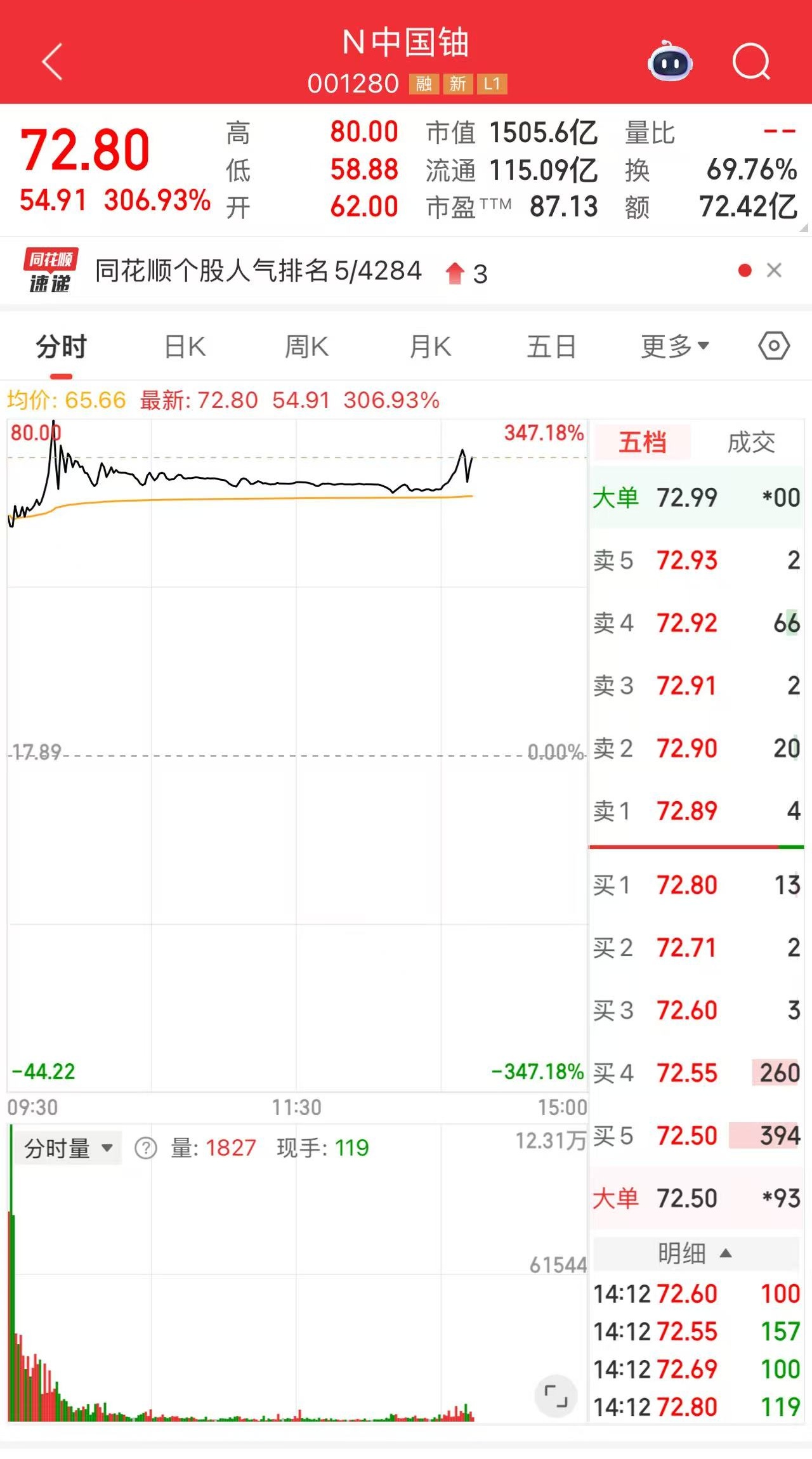 本報(bào)訊 (記者向炎濤)12月3日,中國(guó)鈾業(yè)股份有限公司(以下簡(jiǎn)稱“中國(guó)鈾業(yè)”,證券代碼:001280)在深交所主板掛牌上市,成為A股市場(chǎng)天然鈾第一股。公司發(fā)行價(jià)格為17.89元/股,開盤價(jià)為62元/股,漲幅達(dá)246.56%。開盤后,公司股價(jià)繼續(xù)飆升,一度沖至最高80元/股,盤中最高漲幅達(dá)347.18%。