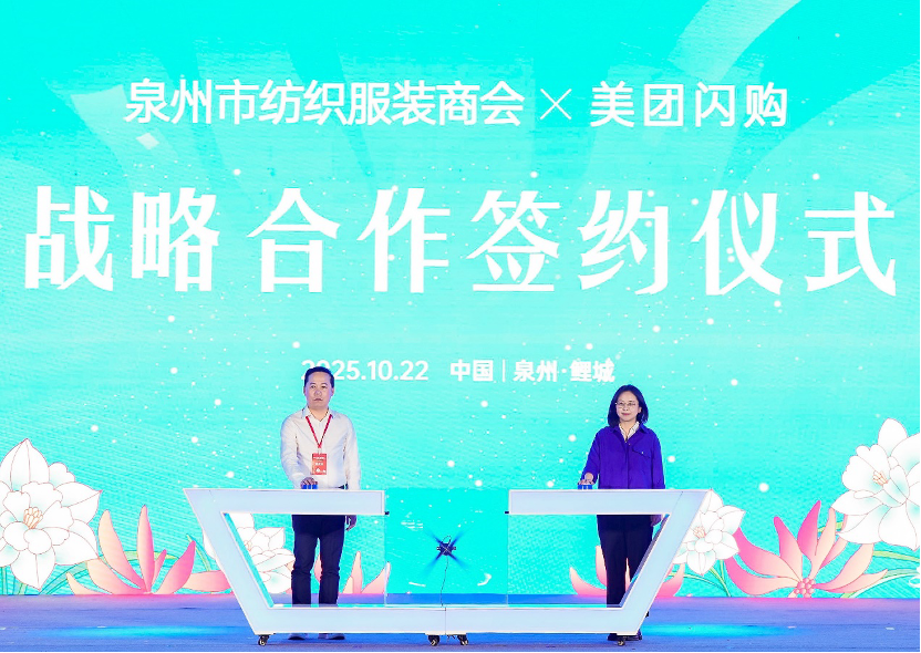 本報訊 (記者梁傲男)10月22日,泉州市紡織服裝商會與美團(tuán)閃購簽約。作為推動泉州實體經(jīng)濟(jì)與數(shù)字消費深度融合的重要舉措,雙方將在服飾及運動品類即時零售領(lǐng)域攜手,擴大企業(yè)銷售渠道、助力品牌發(fā)展。