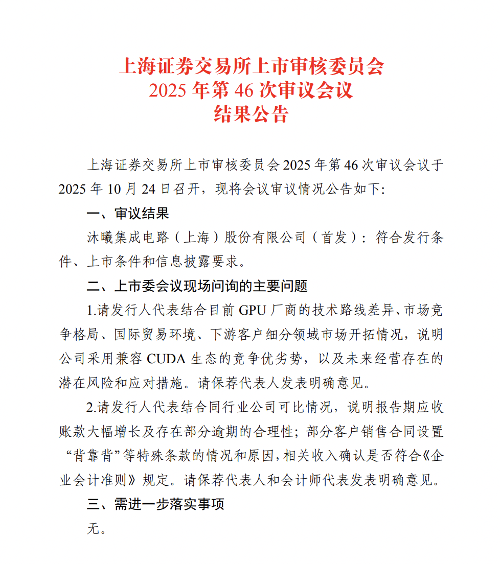 本報(bào)訊 (記者毛藝融)科創(chuàng)板“1+6”新政助力國產(chǎn)GPU開啟發(fā)展競(jìng)速。10月24日,上海證券交易所上市審核委員會(huì)審議通過沐曦集成電路(上海)股份有限公司(下稱“沐曦股份”)科創(chuàng)板IPO申請(qǐng)。上交所官網(wǎng)顯示,沐曦股份上市申請(qǐng)6月30日獲受理,7月19日問詢通過,10月24日上市委會(huì)議通過。