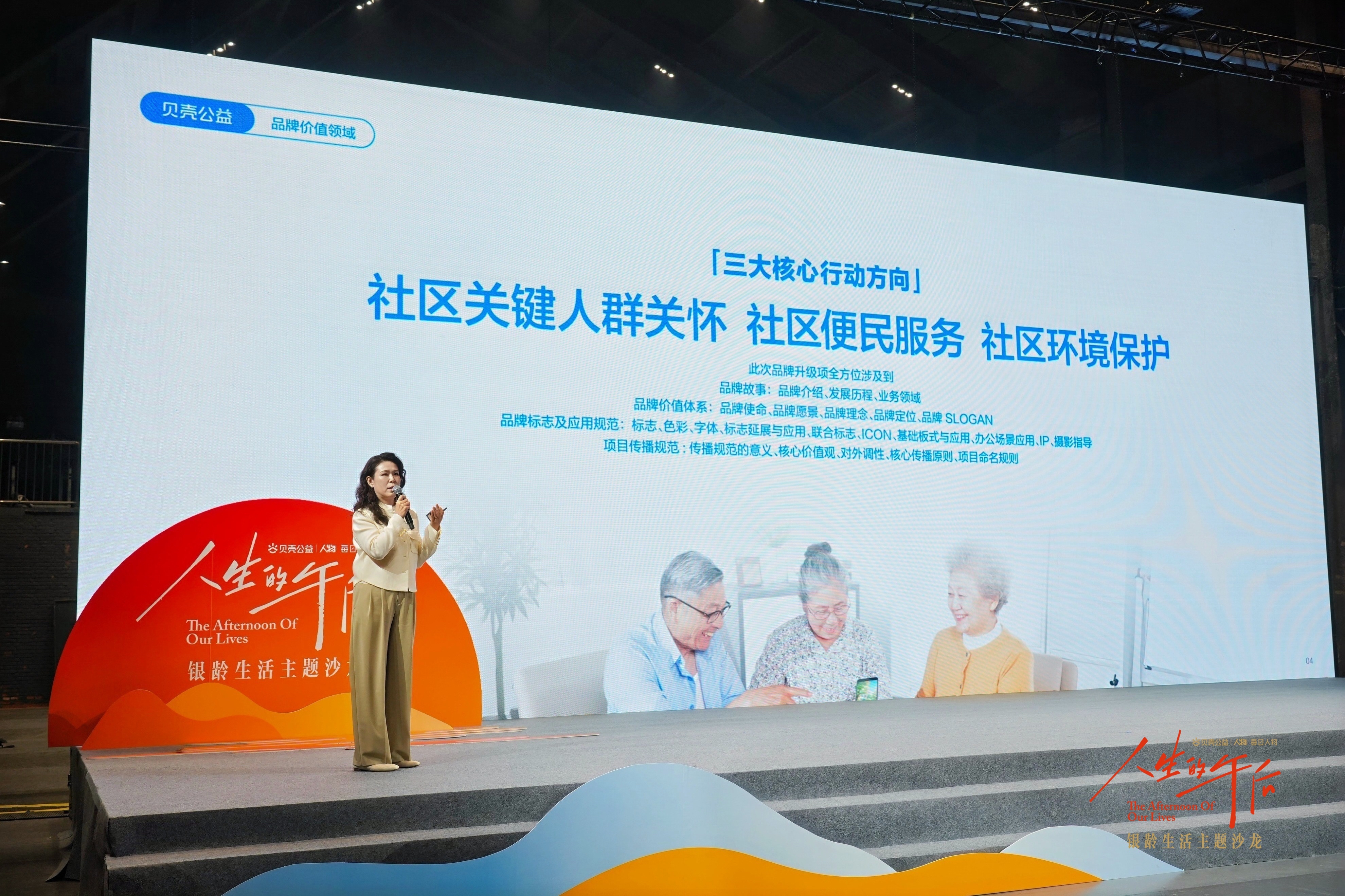 貝殼公益品牌視覺體系同步煥新,以“陽光橙+貝殼藍(lán)”為核心色彩,并首次從中提取出品牌輔助圖形——三道橙色的光束,它代表陽光,也代表“每一點微小的改變”,傳遞溫暖、真實、共建的公益價值觀。賈生平介紹:“當(dāng)我們把它置于社區(qū)場景中,‘讓陽光照進(jìn)每個家’的品牌宣言以及‘讓社區(qū)的每個人成為公益的受益者和參與者’的品牌愿景,有了具象的視覺承載。”