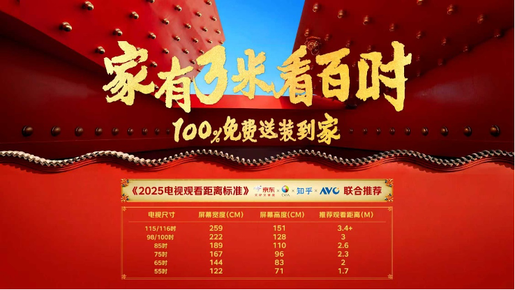 活動期間,京東聯(lián)合視像協(xié)會、知乎、奧維共同發(fā)布《2025電視觀看距離標(biāo)準(zhǔn)》,百吋電視的推薦觀看距離為3米。
