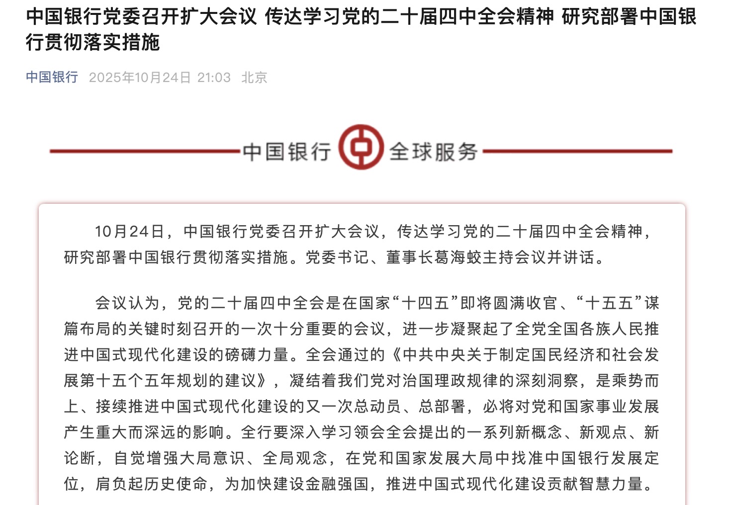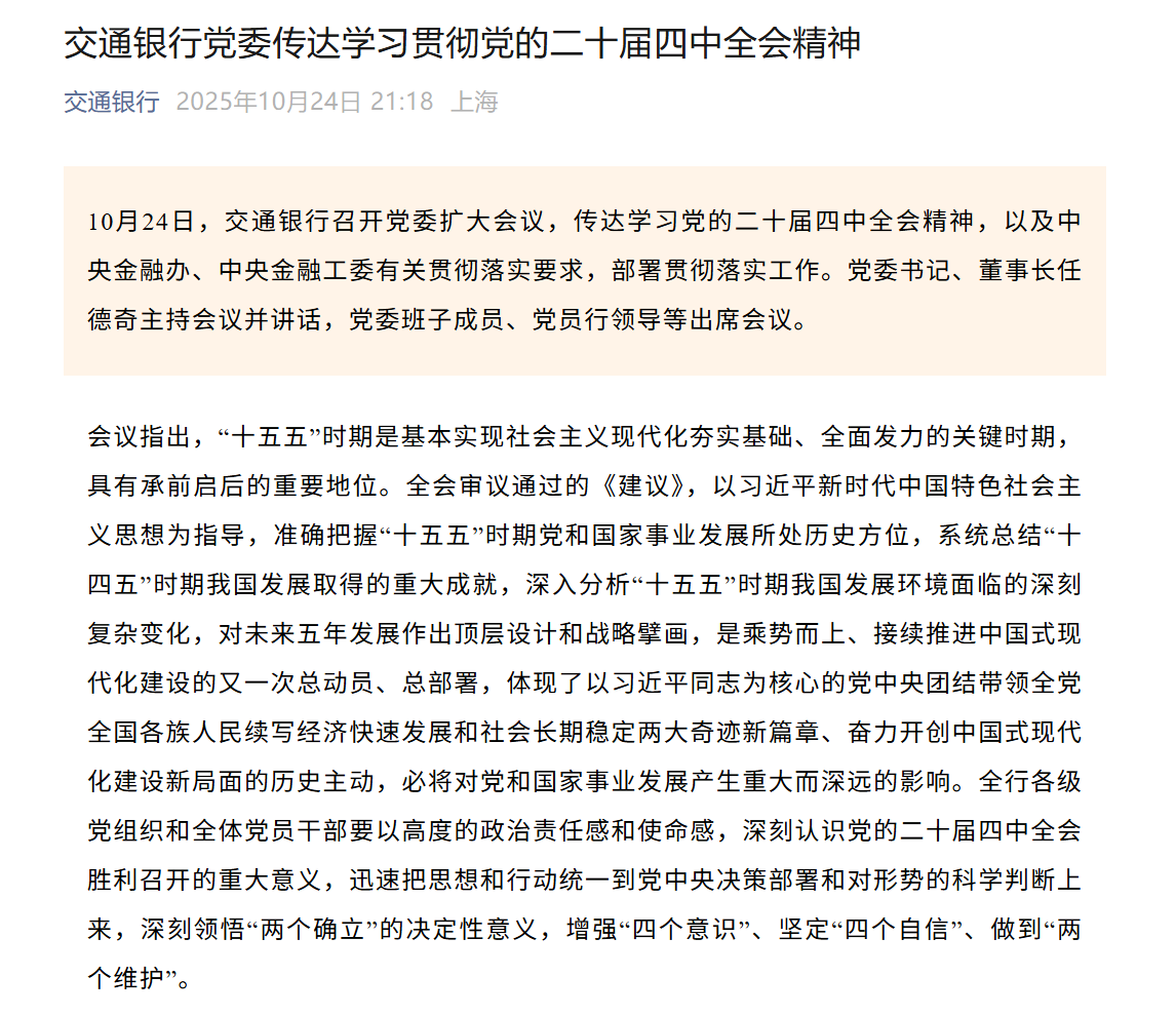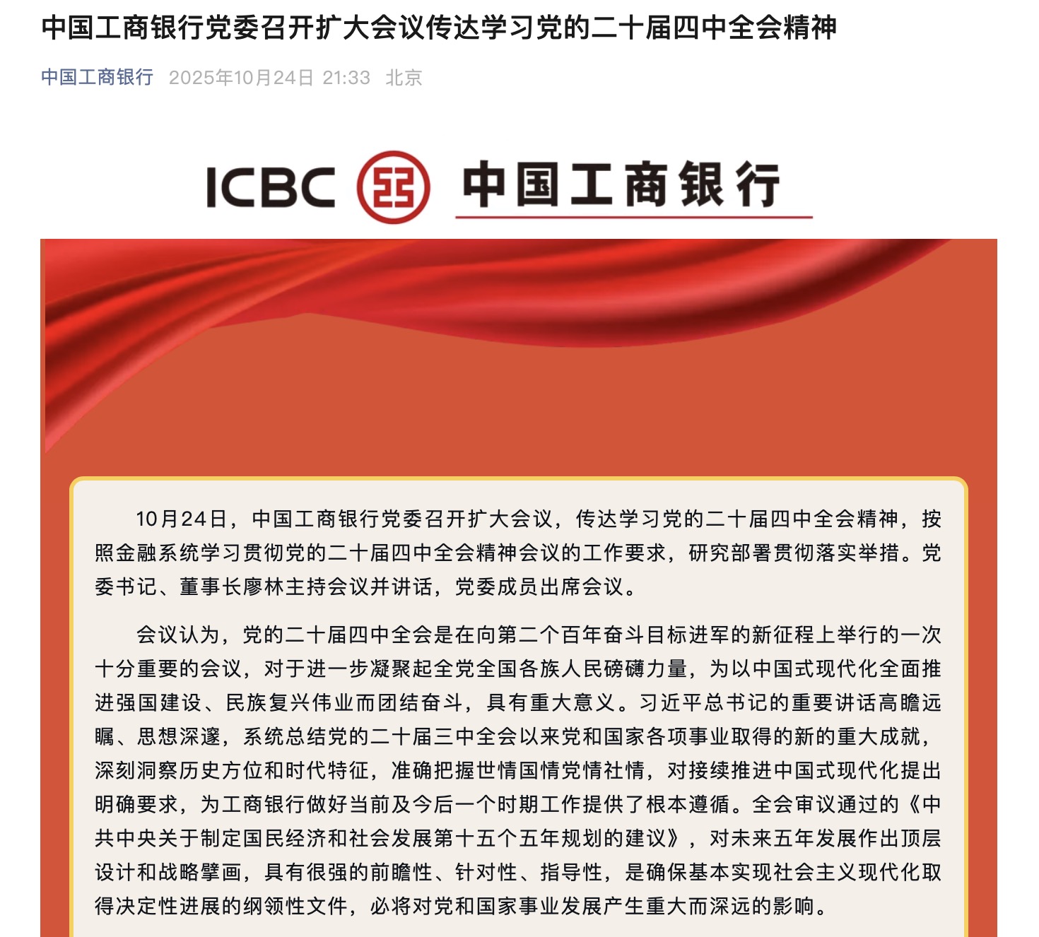 10月24日,工商銀行、農(nóng)業(yè)銀行、中國(guó)銀行、建設(shè)銀行、交通銀行、郵儲(chǔ)銀行黨委紛紛召開(kāi)會(huì)議傳達(dá)學(xué)習(xí)黨的二十屆四中全會(huì)精神,按照金融系統(tǒng)學(xué)習(xí)貫徹黨的二十屆四中全會(huì)精神會(huì)議的工作要求,研究部署貫徹落實(shí)舉措。