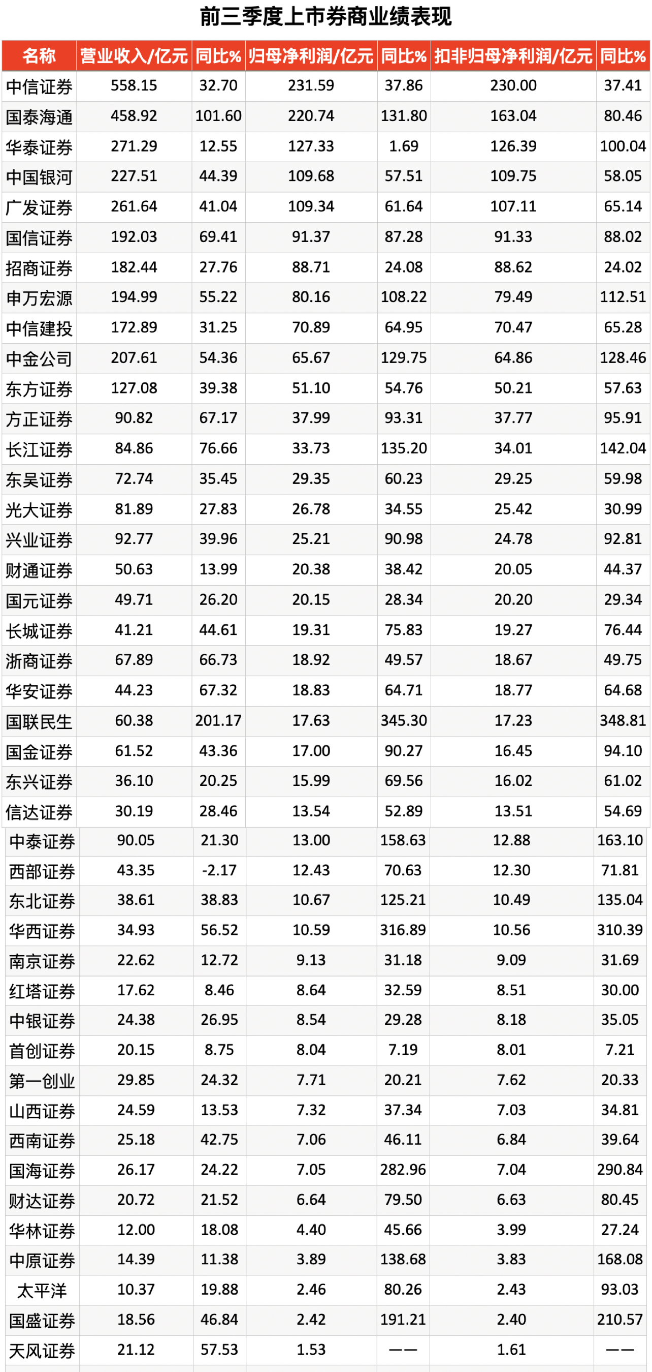 深入剖析前三季度上市券商的業(yè)績(jī)表現(xiàn),在43家上市券商中,有42家券商的營(yíng)業(yè)收入和歸母凈利潤(rùn)均實(shí)現(xiàn)了同比正增長(zhǎng),呈現(xiàn)出“雙增長(zhǎng)”的良好局面;中信證券、國(guó)泰海通、華泰證券、廣發(fā)證券、中國(guó)銀河、中金公司等實(shí)力強(qiáng)勁的頭部券商,營(yíng)業(yè)收入均突破200億元大關(guān),中信證券、國(guó)泰海通、華泰證券、中國(guó)銀河、廣發(fā)證券等5家券商的歸母凈利潤(rùn)均超百億元。