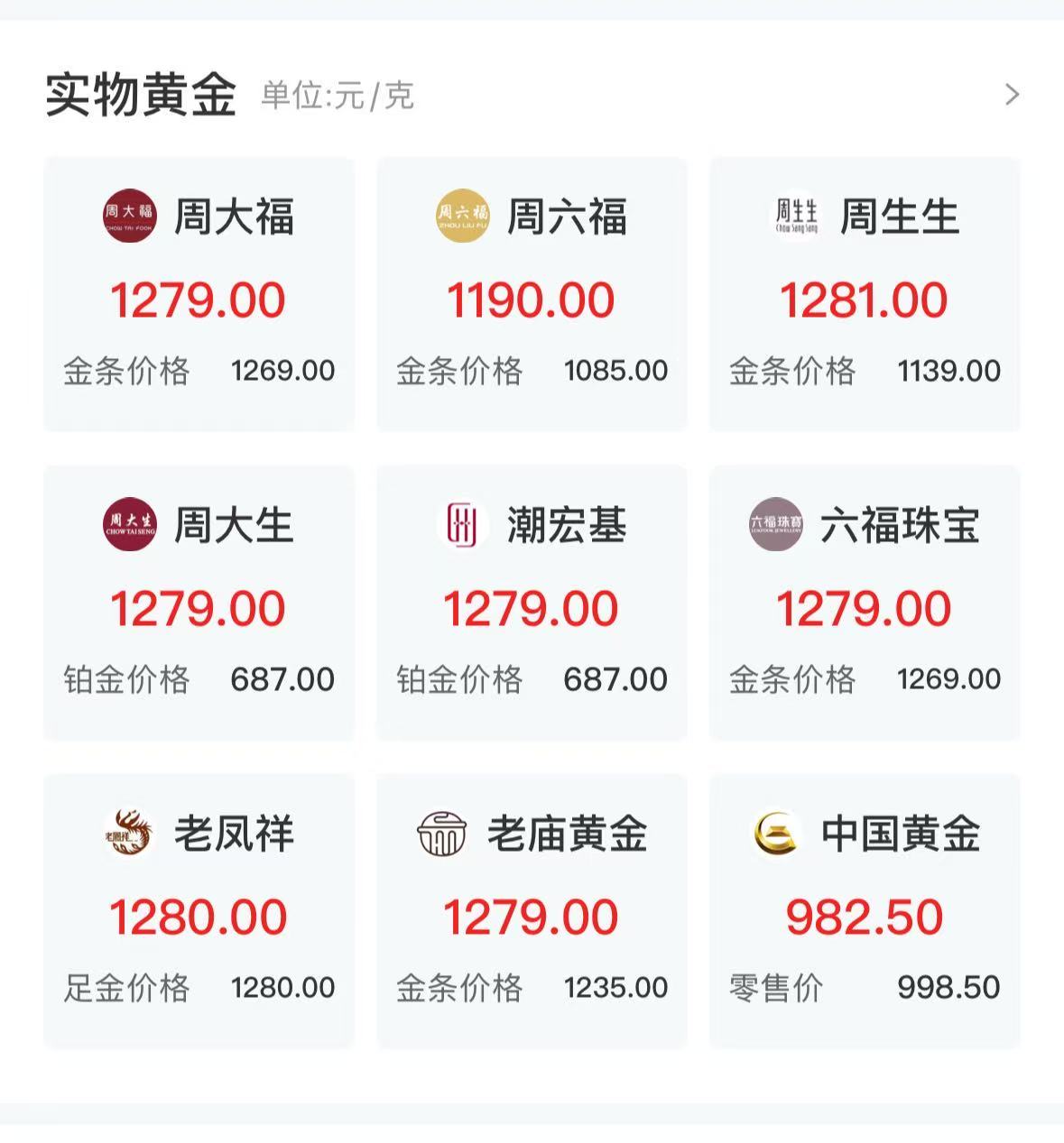 國(guó)內(nèi)金飾方面,東方財(cái)富數(shù)據(jù)顯示,周生生足金價(jià)格已上調(diào)至1281元/克,老廟黃金、周大福、潮宏基、六福珠寶等足金價(jià)格上調(diào)至1279元/克。此外,周大福、六福珠寶金條報(bào)價(jià)達(dá)1269元/克,與金飾足金報(bào)價(jià)僅差10元,老廟黃金金條價(jià)格也達(dá)1235元/克,而周生生等品牌金條報(bào)價(jià)也在1100元/克左右。