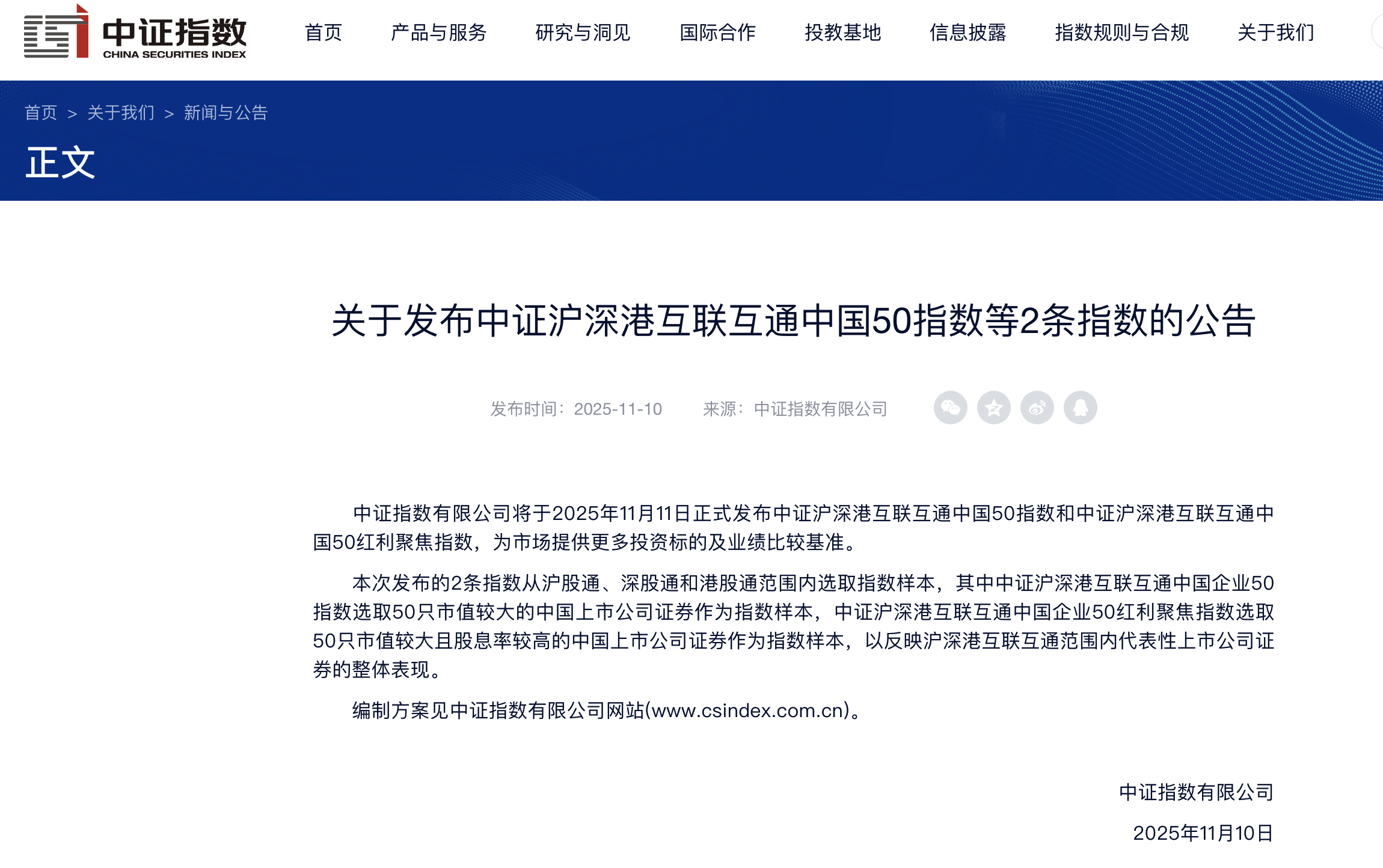 本報(bào)訊 (記者毛藝融)11月10日,中證指數(shù)有限公司在官網(wǎng)公告稱(chēng),將于2025年11月11日正式發(fā)布中證滬深港互聯(lián)互通中國(guó)50指數(shù)和中證滬深港互聯(lián)互通中國(guó)50紅利聚焦指數(shù),為市場(chǎng)提供更多投資標(biāo)的及業(yè)績(jī)比較基準(zhǔn)。