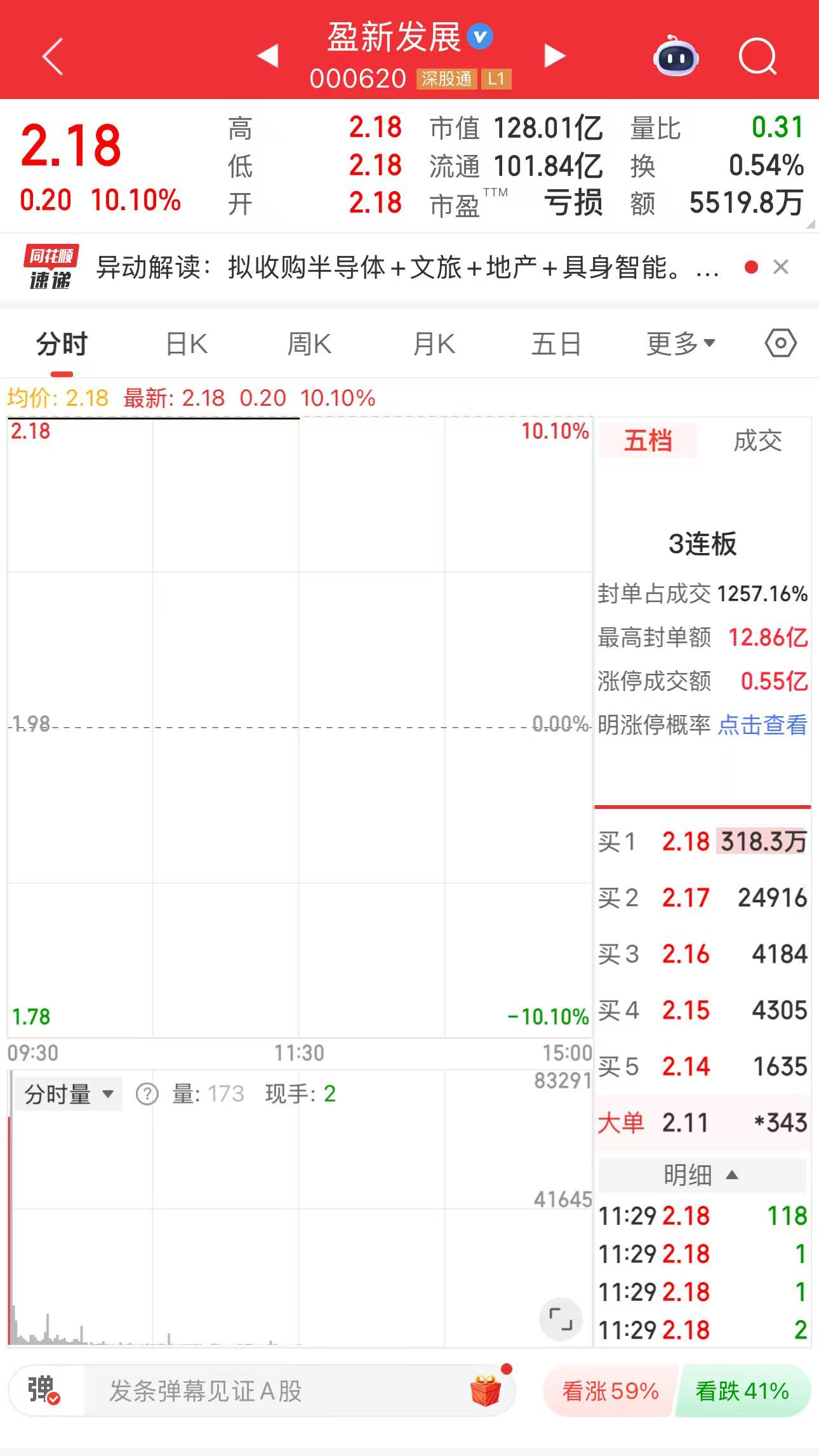 本報訊 (記者向炎濤)在接連斬獲兩個漲停板后,10月22日開盤,北京銅官盈新文化旅游發(fā)展股份有限公司(以下簡稱“盈新發(fā)展”,股票代碼:000620)股價又再次漲停。截至午間收盤,公司股價報收于2.18元/股。
