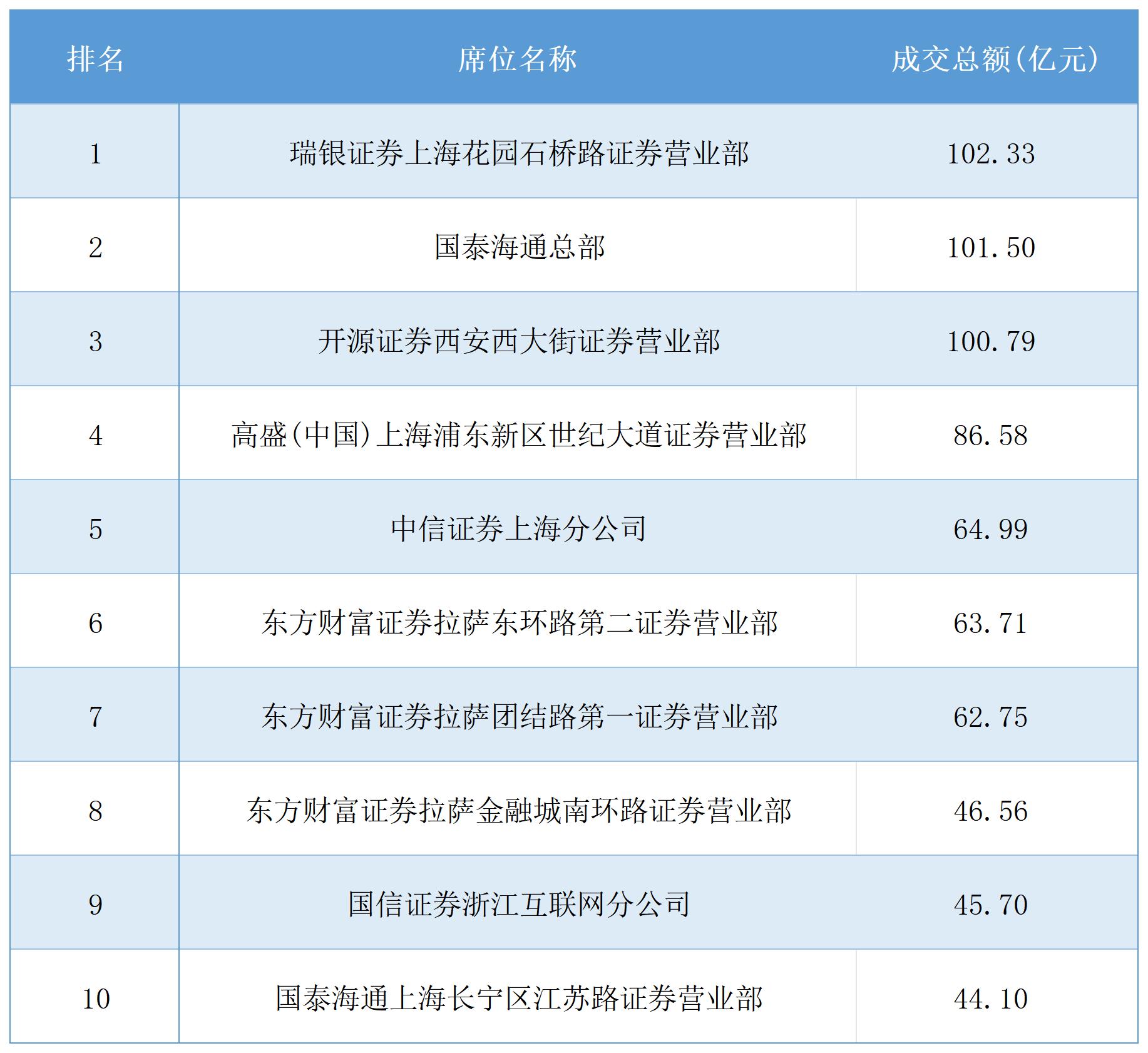 此外,躋身券商龍虎榜前十名的營業(yè)部還包括中信證券上海分公司、東方財(cái)富證券拉薩東環(huán)路第二證券營業(yè)部、東方財(cái)富證券拉薩團(tuán)結(jié)路第一證券營業(yè)部、東方財(cái)富證券拉薩金融城南環(huán)路證券營業(yè)部、國信證券浙江互聯(lián)網(wǎng)分公司、國泰海通上海長寧區(qū)江蘇路證券營業(yè)部,依次為第五名至第十名。