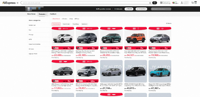 速賣通店鋪頁面顯示,目前上架的車輛以中國(guó)品牌為主,新能源車型占比較多,包括比亞迪元、吉利星愿、小米SU7、理想L7、小鵬G9等。其中不少都已加入速賣通“百億補(bǔ)貼”品牌出海。 圖:速賣通賣車頁面
