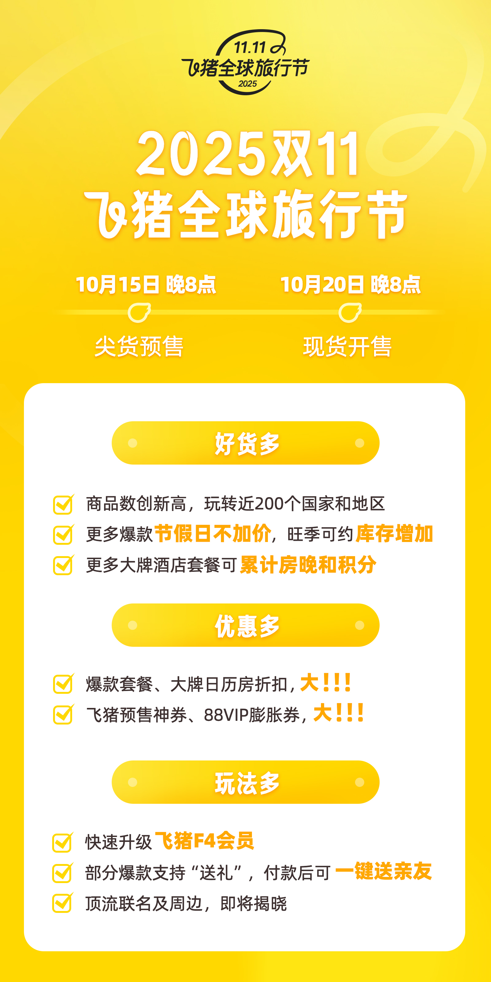10月15日,飛豬宣布2025年“雙11”全球旅行節(jié)啟動,其中尖貨預售于當日晚8點開始,全量現(xiàn)貨將于20日晚8點開始。