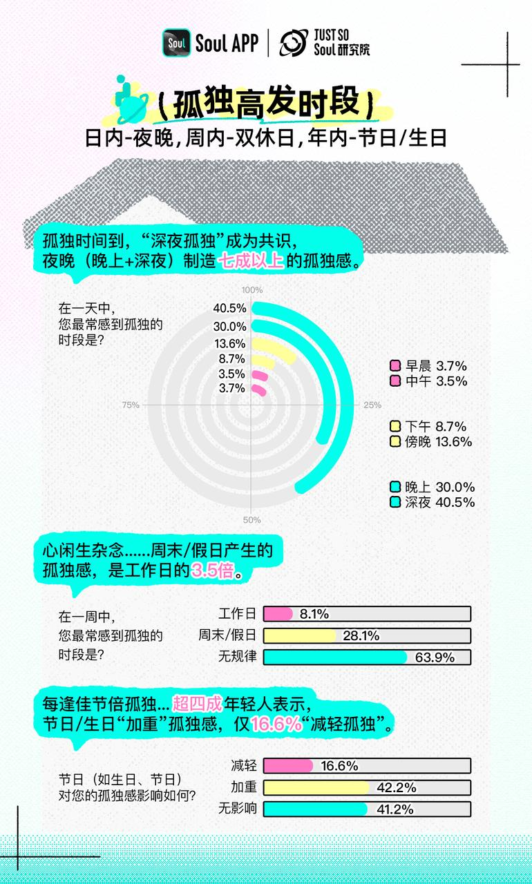 在較長(zhǎng)的一周周期之中,周末/假日產(chǎn)生的孤獨(dú)時(shí)刻是工作日的3.5倍之多;而在年內(nèi),42.2%的年輕人表示節(jié)日/生日會(huì)“加重”自己的孤獨(dú)感,前者是喜氣洋洋的樂(lè)景襯托出“作者”的哀情,后者是越長(zhǎng)大越孤單,越長(zhǎng)大越不安.....。