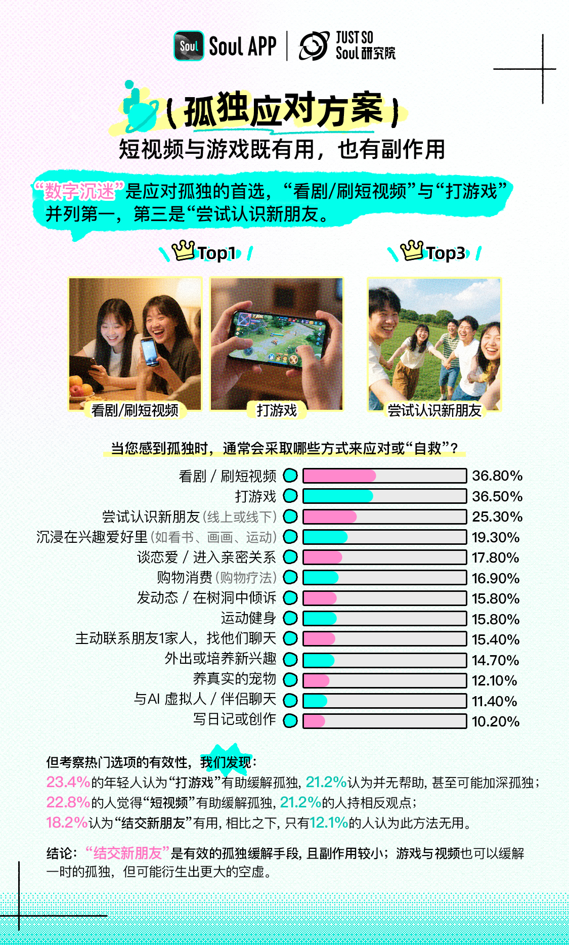 相比之下,有25.3%的年輕人認(rèn)為“認(rèn)識(shí)新朋友”有助于緩解孤獨(dú),且這種方案的“不滿意率”只有12%(相較游戲與短視頻均超過(guò)20%)綜合來(lái)看,“結(jié)交好友”是有效手段中副作用最小的,因其能直接針對(duì)孤獨(dú)的本質(zhì)——高質(zhì)量社交連接的缺失。