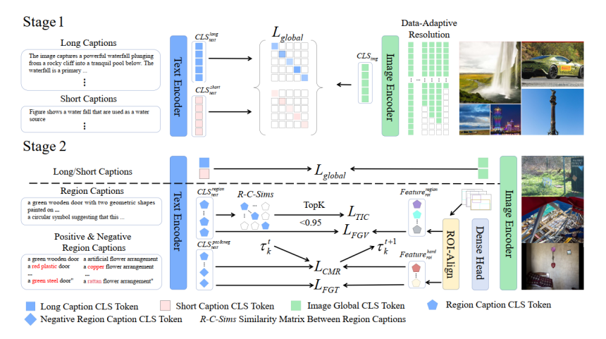 在訓練方法上,模型采用了革命性的兩階段策略。其關(guān)鍵的第二階段摒棄了傳統(tǒng)CLIP的“整體對整體”的粗放對齊模式,升級為“局部對局部”的精細對齊,這正是其實現(xiàn)細粒度理解的精髓所在。